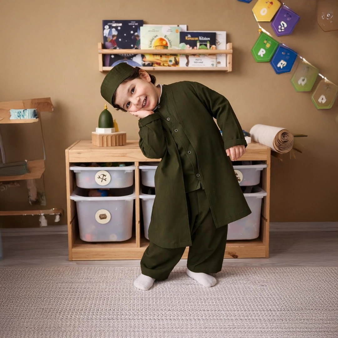 By Mini Molla imzasını taşıyan bu özel 4’lü takım set, çocuklar için hem konforu hem de zarif bir görünümü bir arada sunmak amacıyla tasarlanmıştır. Mevsimlik 1. kalite pamuklu kumaştan üretilen takım; yelek, şalvar, gömlek ve cübbeden oluşmaktadır. Nefes alabilen, terletmeyen ve cilt dostu yapısı sayesinde gün boyu rahat bir kullanım sağlar. Yumuşak dokusu çocukların hassas cildine uyum sağlarken, kaliteli kumaş yapısı formunu uzun süre korur.
