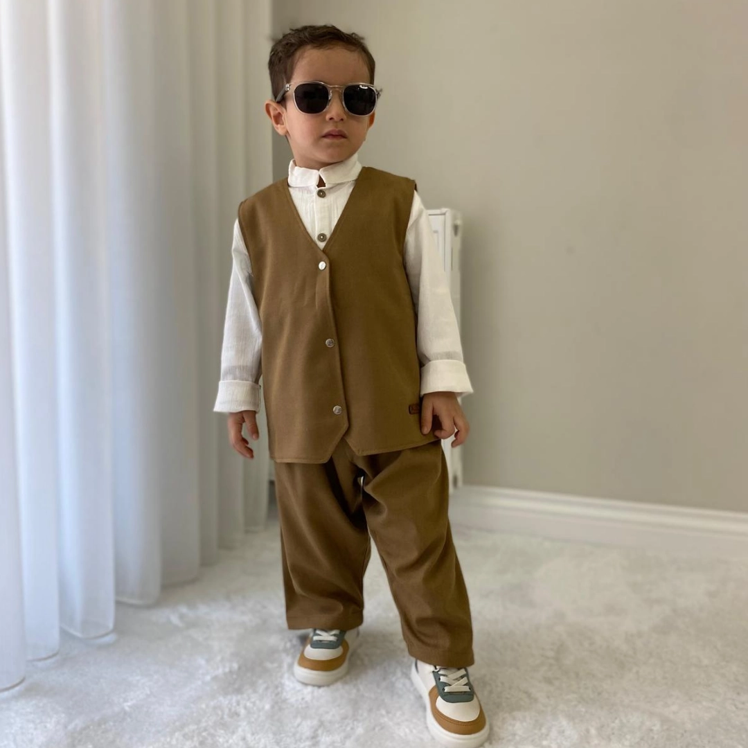 Modern ve sade tasarımı geleneksel çizgilerle buluşturan bu set; bayram, özel gün, davet, söz, nişan ve çeşitli organizasyonlarda zarif bir görünüm oluşturur. Rahat kesime sahip şalvar hareket özgürlüğü sağlarken, gömlek ve yelek kombinasyonu bütünlüklü ve dengeli bir stil sunar. Dökümlü yapısı sayesinde hem salaş hem de düzenli bir duruş elde edilir. Çocukların hem rahat hareket edebileceği hem de şık görüneceği bir kombin arayan aileler için ideal bir tercihtir.