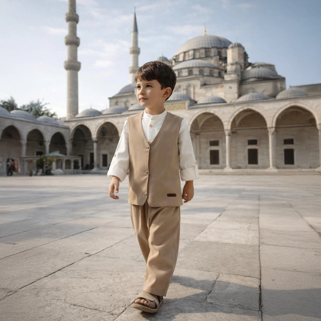 By Mini Molla imzasını taşıyan bu özel 4’lü takım set, çocuklar için hem konforu hem de zarif bir görünümü bir arada sunmak amacıyla tasarlanmıştır. Mevsimlik 1. kalite pamuklu kumaştan üretilen takım; yelek, şalvar, gömlek ve cübbeden oluşmaktadır. Nefes alabilen, terletmeyen ve cilt dostu yapısı sayesinde gün boyu rahat bir kullanım sağlar. Yumuşak dokusu çocukların hassas cildine uyum sağlarken, kaliteli kumaş yapısı formunu uzun süre korur.