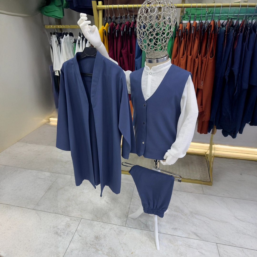 Geleneksel çizgilerin modern bir yorumla buluştuğu bu tasarım; bayram, özel gün, davet, söz, nişan ve çeşitli organizasyonlarda şık ve asil bir stil oluşturur. Rahat kalıplı şalvar hareket özgürlüğü sunarken, gömlek ve yelek kombinasyonu dengeli ve bütünlüklü bir görünüm sağlar. Uzun cübbe tasarımı ise takıma güçlü ve dikkat çekici bir hava kazandırır. Dökümlü yapısı sayesinde hem salaş hem de düzenli bir duruş elde edilir.